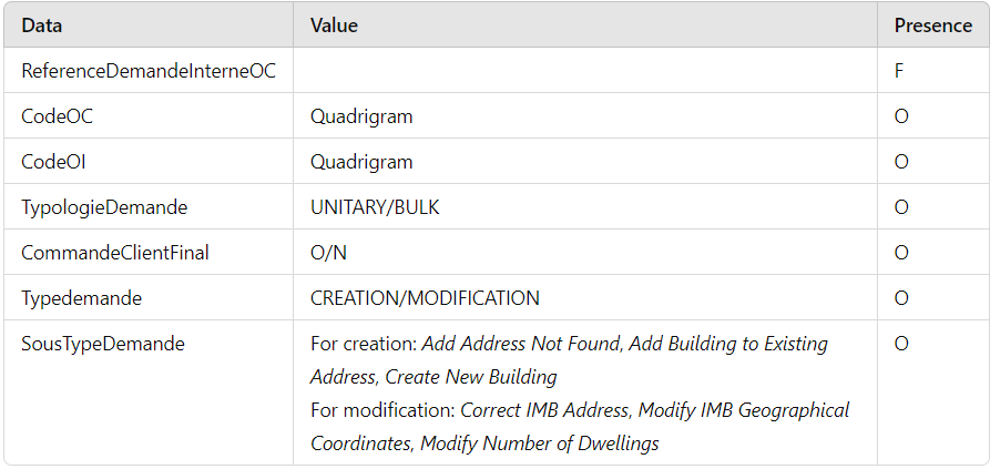 This document describes version 1.0 of the standardized tool defined by the Interop’fibre Group for the creation or modification of IPE addresses by the infrastructure operator following a request from the commercial operator.