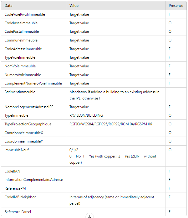4. Textual Address Fields: (CodePostalImmeuble, CommuneImmeuble, TypeVoieImmeuble, NomVoieImmeuble, NumeroVoieImmeuble, and optionally ComplementNumeroVoieImmeuble)