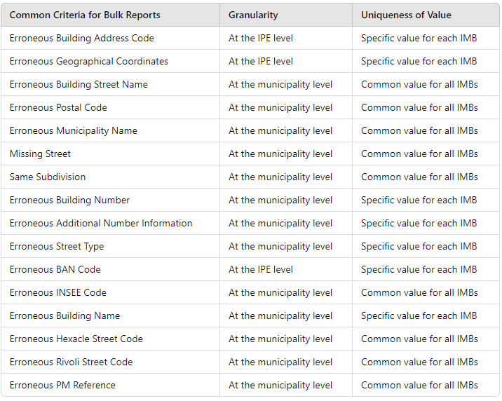 • Bulk Reports: For example, a list of anomalies detected through automated checks with a common criterion (e.g., anomalies in the same field). These involve reports affecting two or more IPE lines. Certain criteria must relate to the same geographical area.